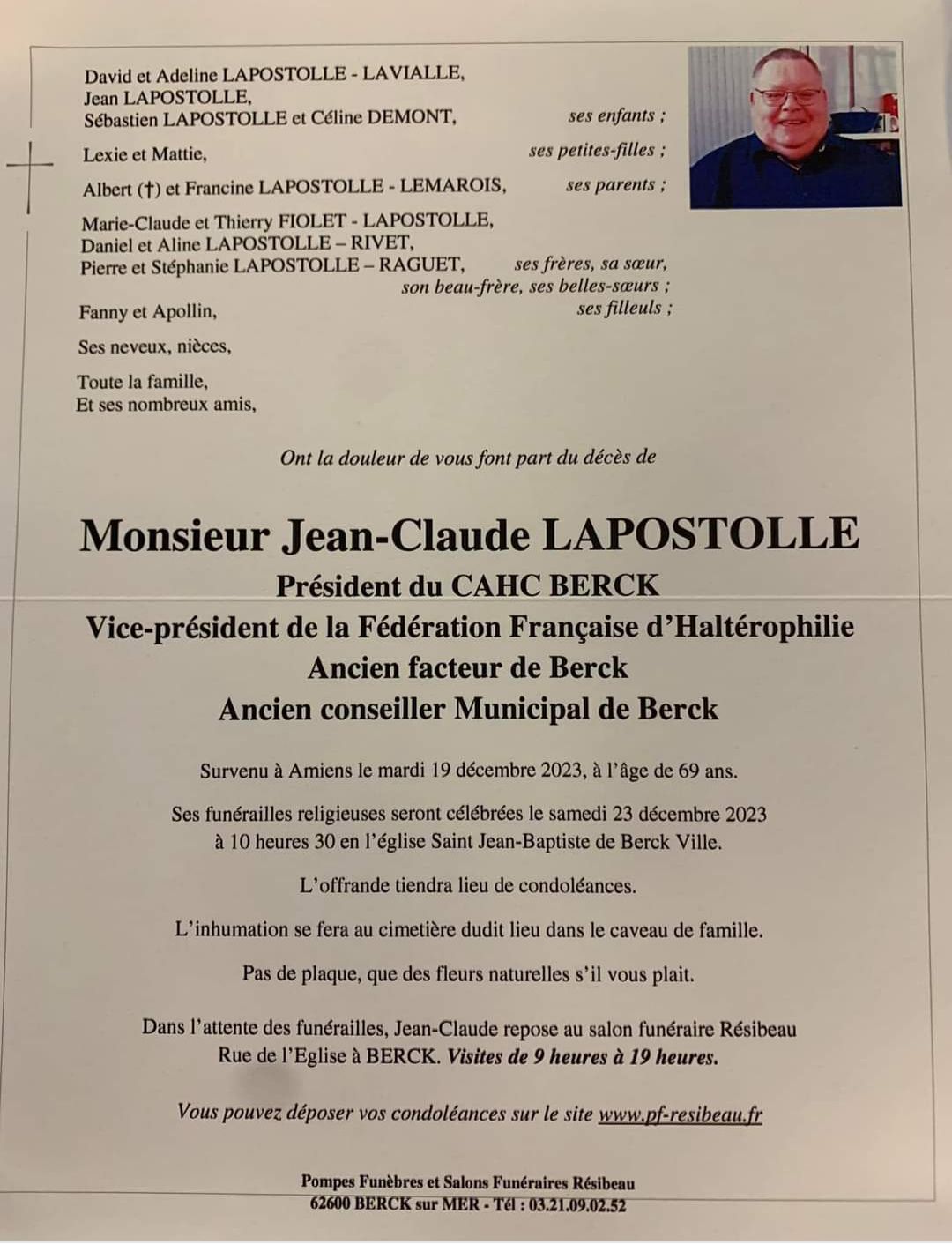 C'est avec une immense tristesse que nous aprenons le décès de Jean Claude LAPOSTOLLE